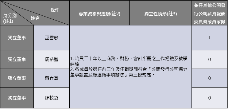 • 由獨立董事組成審計委員會,負責監督公司財務報表、簽證會計師之選(解)任、監督公司內部控制及法令遵循。
