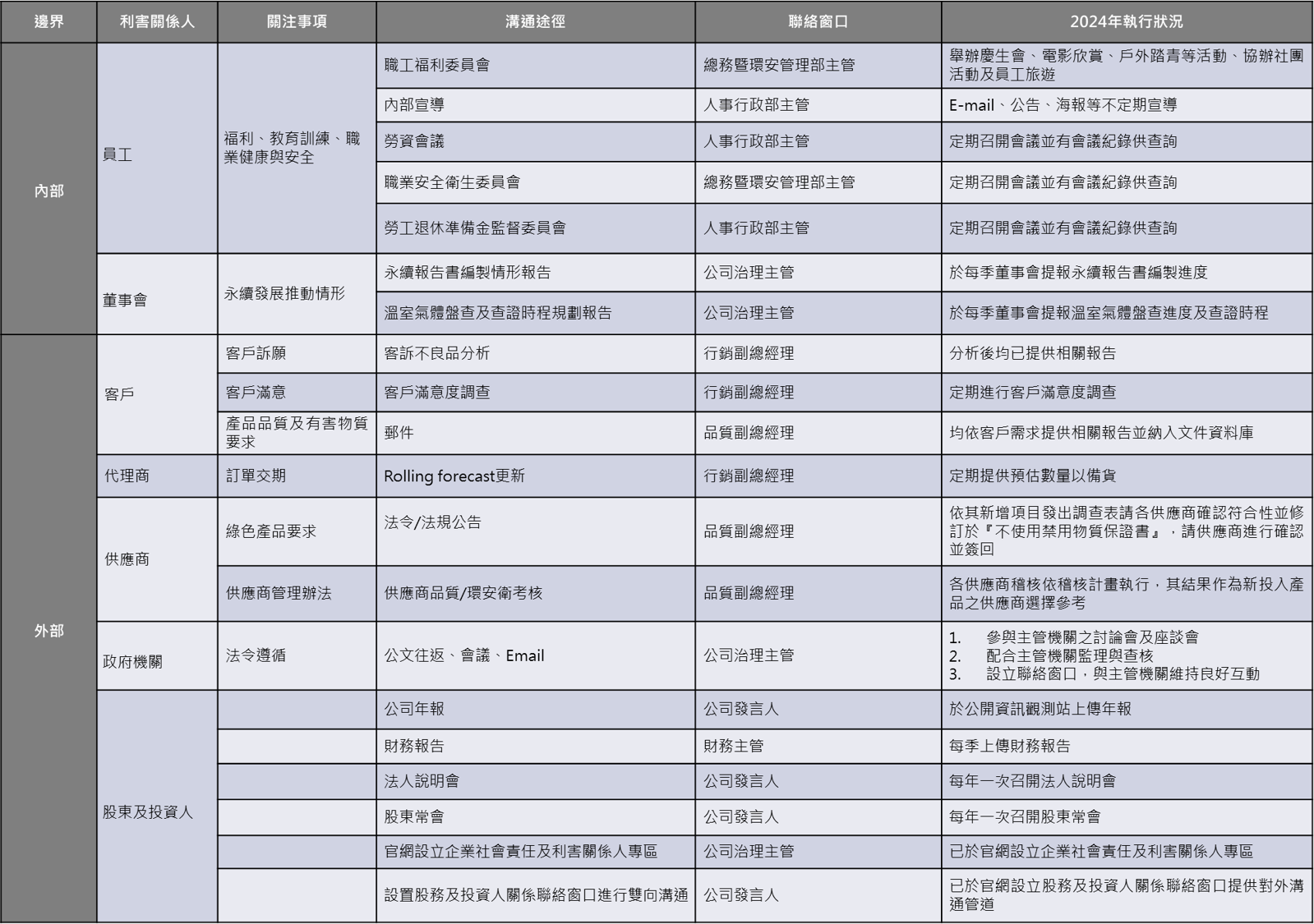 本公司履行企業社會責任,在誠信原則下追求永續經營與獲利,並重視環境、社會與公司治理等各項議題。希望透過與利害關係人之適當溝通,瞭解利害關係人之合理期望及需求,與其所關切之重要企業社會責任議題,並將其納入訂定公司未來管理方針與營運活動之依據參考,並已於2024年8月12日將與各利害關係人溝通情形報告至董事會。
