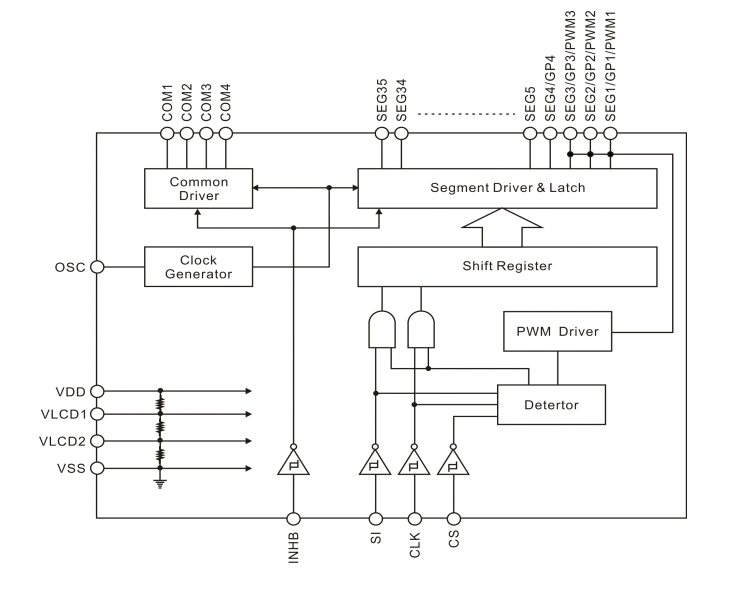 ● Up to 140 segments for 1/4 duty drive can be displayed