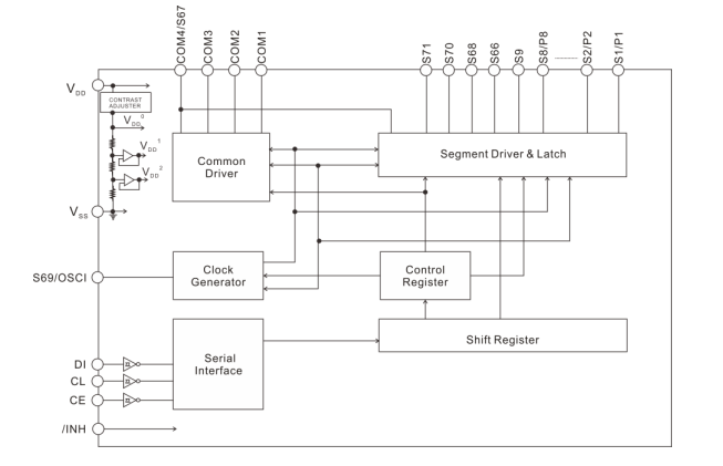 ● Switching between 1/2 bias and 1/3 bias drive techniques under serial data control