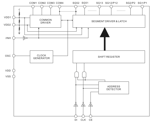 ● 1/2 bias and 1/3 bias drive schemes can be controlled from serial data.