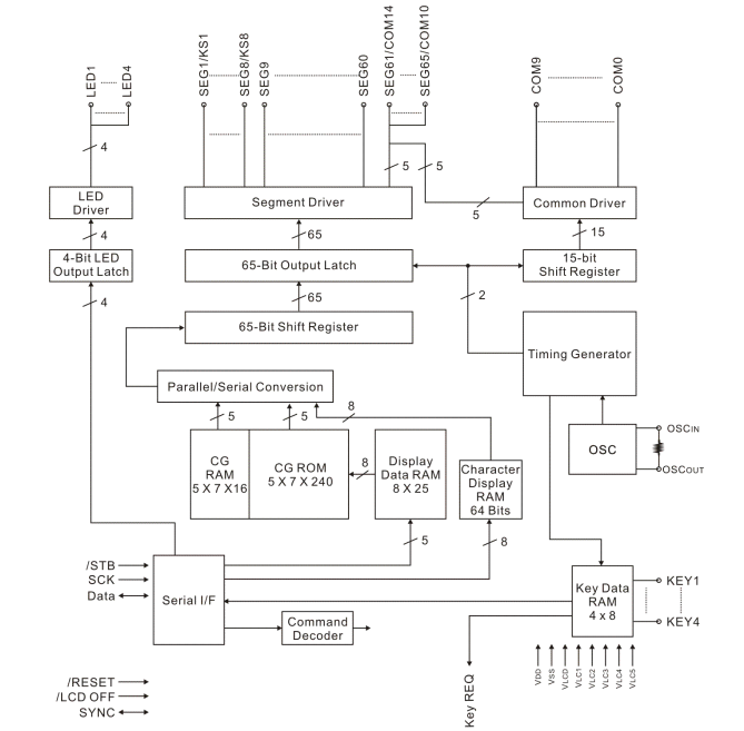 - 1/8 duty: 13 columns × 1 line, 64 pictograph displays, 4 LEDs