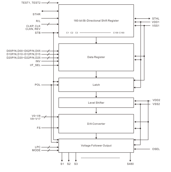 The PT16103 is a CMOS silicon source driver IC for active matrix TFT LCD panels. After a CMOS/RSDS 6-bit RGB data is applied, this device will generate 64-gray scale for driving the TFT LCD panel source lines. It supports 480/402 channel selectable function, shift right/left selectable function, and cascade function for dot expansion