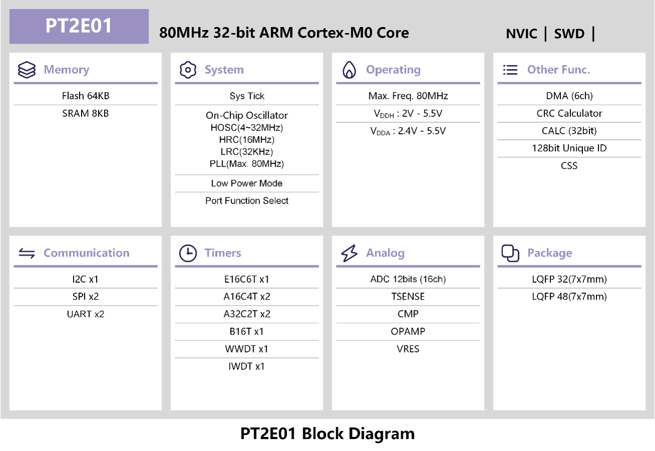 PT2E01屬於入門等級(Entry Level)通用型MCU,集成高性能ARM Cortex-M0 32位內核。 晶片最高工作頻率為80MHz,以及最大64KBytes Flash與8KBytes SRAM。 提供廣泛且有效的功能模組,與符合標準的通信介面,包括1個I2C,2個SPI和2個UART。 支持豐富的定時器資源,1個16位增強型定時器(E16C6T),2個32位進階定時器(A32C2T),2個16位進階定時器(A16C4T),1個16位基本計時器(B16T)。