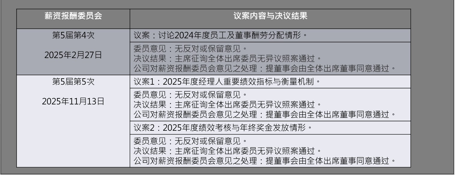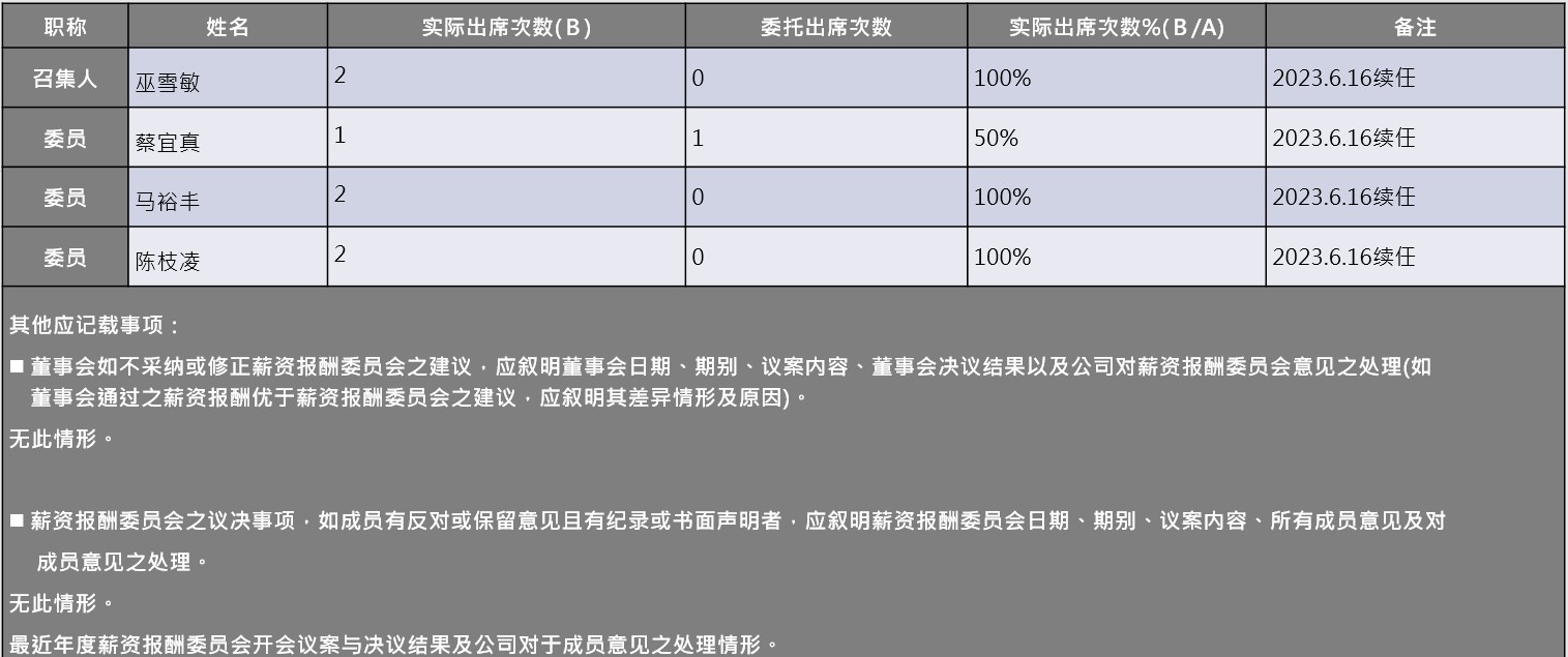 本公司自2011年起设立薪资报酬委员会,已于2023年度由新任之四名独立董事组成新一届薪资报酬委员会每年至少开会两次,负责订定并定期评估公司整体薪资报酬政策;订定并定期检讨董事及经理人绩效评估与薪资报酬之政策、制度、标准与结构。114年度薪酬委员会共召开次会议,全体委员均全程参与各次会议。其主要职能如下: