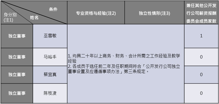 1.       巫雪敏独立董事拥有美国芝加哥大学商学研究所硕士学位,自94年起担任本公司独立董事及审计委员。曾任职东元电机总稽核及大成长城企核处副总经理,专精财务会计、公司治理及内部稽核等专业能力,对企业经营、薪酬绩效管理及企业成长具备丰富经历,并具备财务资讯解析与运用能力。