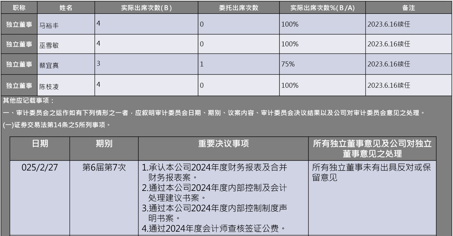 4.       陈枝凌独立董事拥有政治大学会计研究所硕士学位,自112年起担任本公司独立董事及审计委员。曾担任财团法人会计研究发展基金会研究员,淡江大学会计系讲师兼会计处稽核主任及台北市会计师公会会计审计委员会委员,目前任职日正联合会计师事务所合伙会计师,专精财务会计、公司治理及内部稽核等专业能力,对企业经营及企业成长具备丰富经历,并具备财务资讯解析与运用能力。