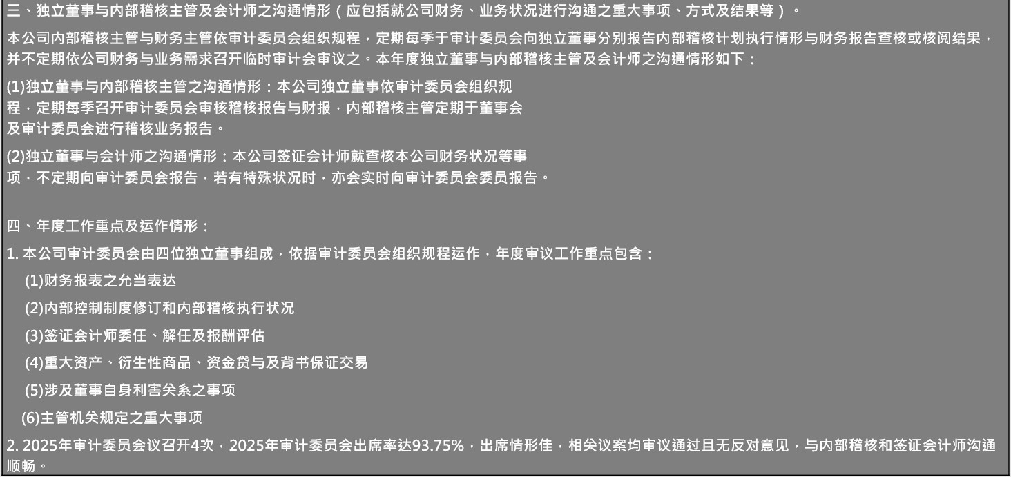 审计委员会每季定期召开会议,于其职权范围内,得邀请管理阶层、内部稽核人员、公司聘任之会计师或其他人列席会议并提供相关资讯。114年度审计委员会共召开四次会议,全体委员均全程参与各次会议。其主要职能如下: