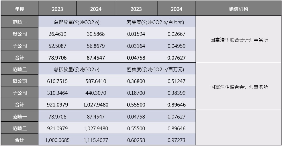 温室气体最近两年度之排放量(公吨CO2 e)、密集度(公吨CO2 e/百万元)及资料涵盖范围